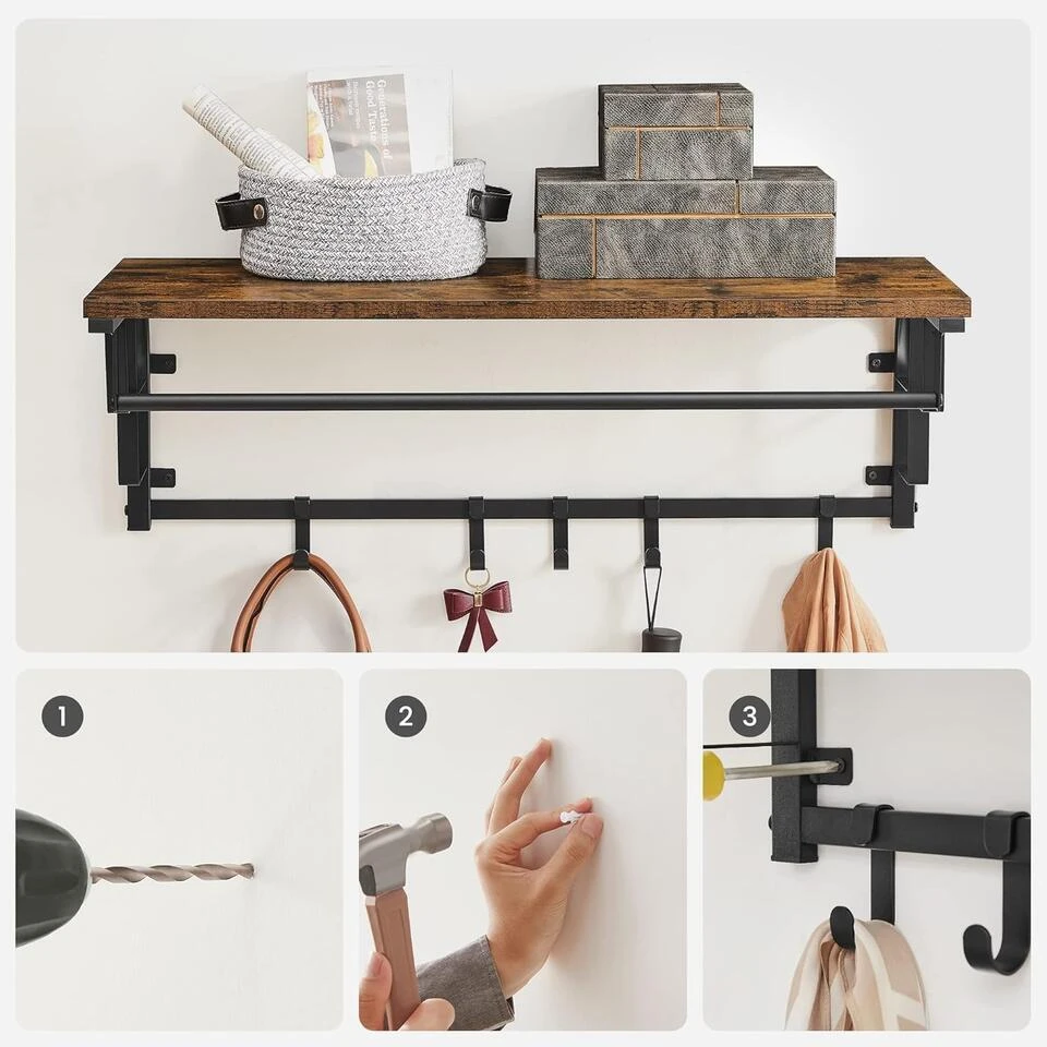 Deze 3-in-1 wandkapstok combineert een stevige plank van 30 x 66 cm, een ophangstang en 5 haken. Ideaal voor jassen, tassen, paraplu’s, sleutels en meer, zodat alles overzichtelijk op één plek blijft.