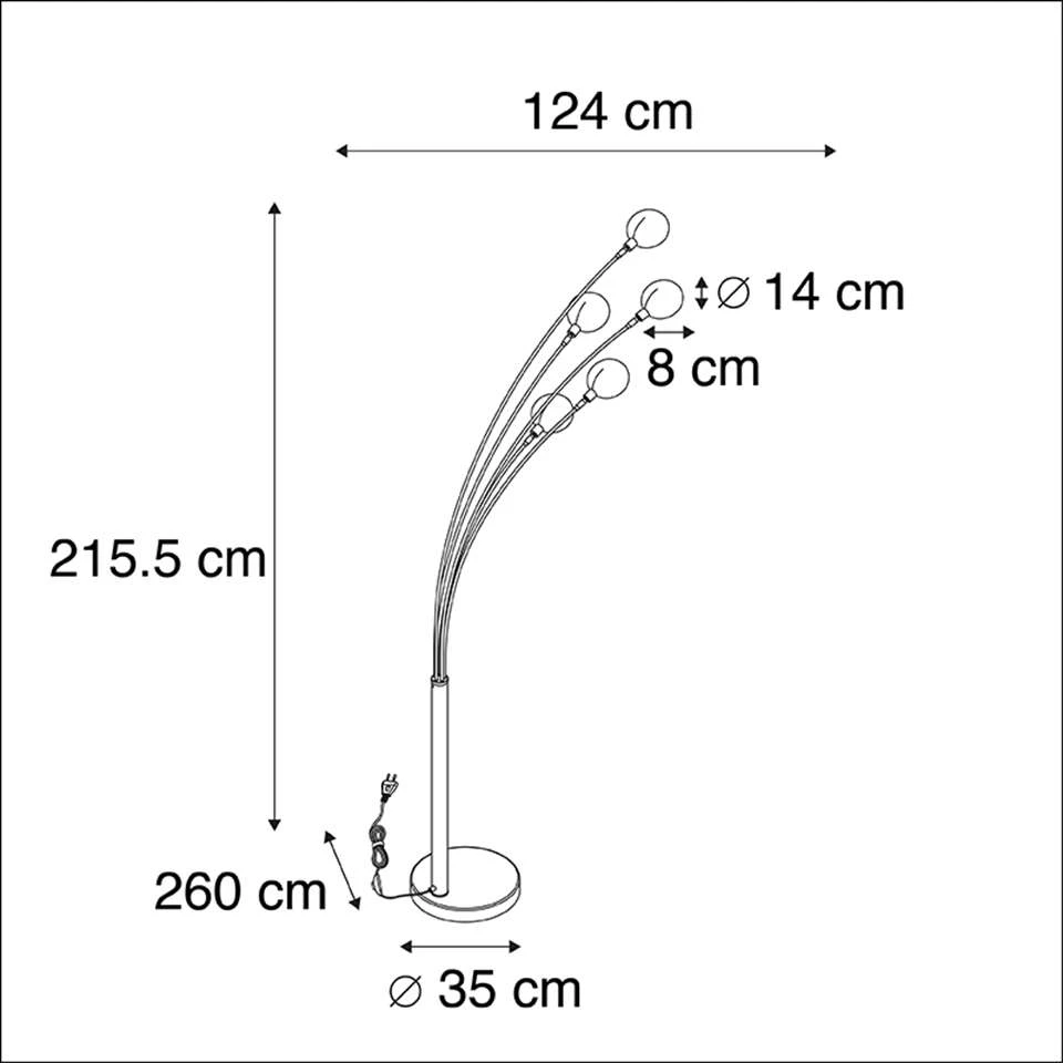 Deze vloerlamp is een echt design stuk in jouw huis! Hij past perfect in een moderne omgeving. Hij heeft een totale hoogte van 215,5 cm en een lengte van 124 cm: een echte eyecatcher dus! De lamp is afgewerkt met een marmeren voet (diameter van 35 cm) en heeft een mooie stalen kleur. Hij is afgewerkt met 5 lichtpunten. Voor elk lichtpunt heb je een leuke lichtbron nodig passend in een E14 fitting (max. 40 Watt). De lamp is dimbaar met een externe dimmer. Het artikel wordt met snoer en stekker geleverd waarvan de lengte maximaal 260 cm is. Maak je interieur af met deze design lamp en geef een leuk extraatje aan je woonkamer!
