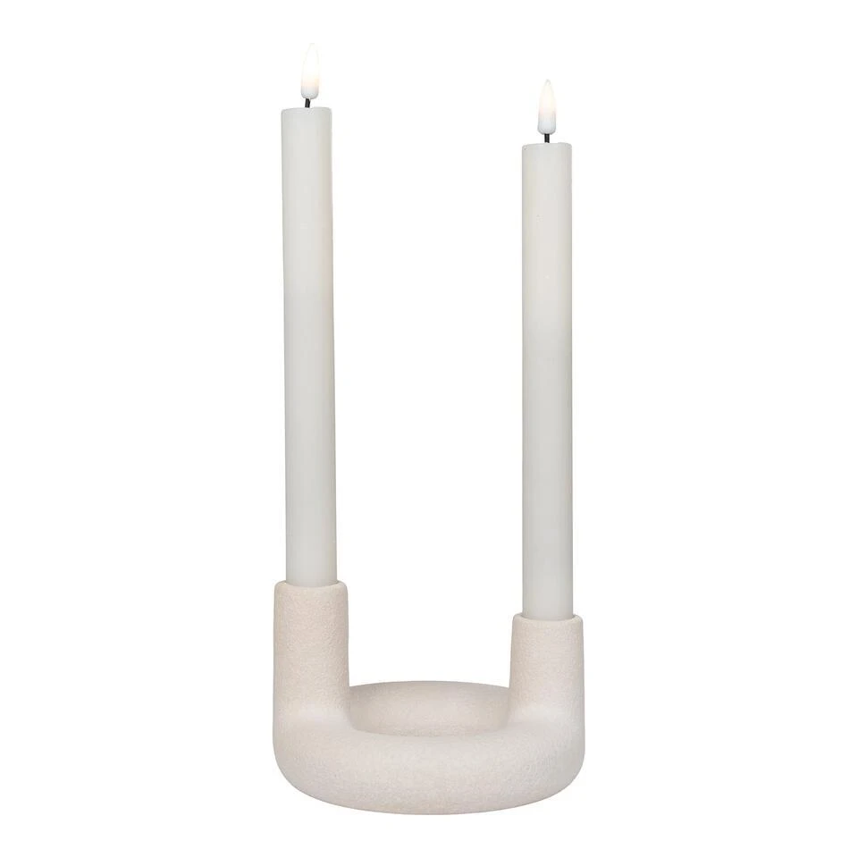 Het unieke ontwerp van deze kandelaar is geïnspireerd door organische vormen, waardoor het een zachte en uitnodigende uitstraling heeft. De beige kleur is veelzijdig en past perfect in diverse interieurstijlen, van minimalistisch tot bohemian. Dankzij het dubbele kaarsenontwerp kun je twee kaarsen tegelijk branden, wat zorgt voor een warme en gezellige sfeer.