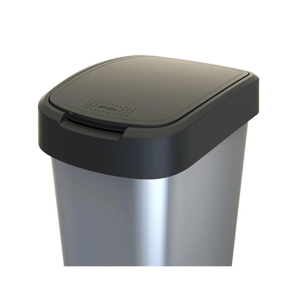 Deze rechthoekige Twist afvalbak van Rotho heeft een moderne industriële look en heeft een robuust design. De afvalbak, uitgevoerd in donkergrijs past perfect binnen iedere inrichting. Vingerafdrukken vind je niet terug op deze afvalbak en ook is hij gemakkelijk te reinigen met een doekje. Daarnaast is de afvalbak gemaakt van duurzaam kunststof en is hij voorzien van een handig kanteldeksel die op 2 manieren te openen is. De vuilniszak is eenvoudig te bevestigen aan de bak en wordt door het deksel op de plek gehouden. De afmeting van deze Twist afvalbak is 40,1 x 29,8 x 60,2 cm en heeft een inhoudsmaat van 50 liter.