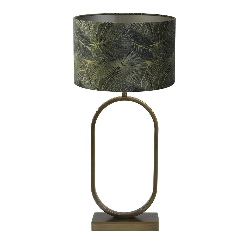 Op zoek naar de perfecte tafellamp inclusief lampenkap? De Jamiri is een moderne antiek bronzen lampvoet van metaal en wordt geleverd inclusief cilinder lampenkap Amazone. Deze lampenkap heeft een stoere print met prachtige bladeren, gemaakt van een luxe stof. De antiek bronzen zwarte lampvoet past in ieder interieur en is daarom een gegarandeerd tijdloze tafellamp in de woonkamer of als nachtlampje in de slaapkamer. Doordat de voet inclusief kap wordt geleverd, hoef jij je geen zorgen te maken of de verhoudingen wel kloppen. De kap past perfect op de ovale lampvoet. De totale afmeting van de tafellamp is 30x30x67 cm.