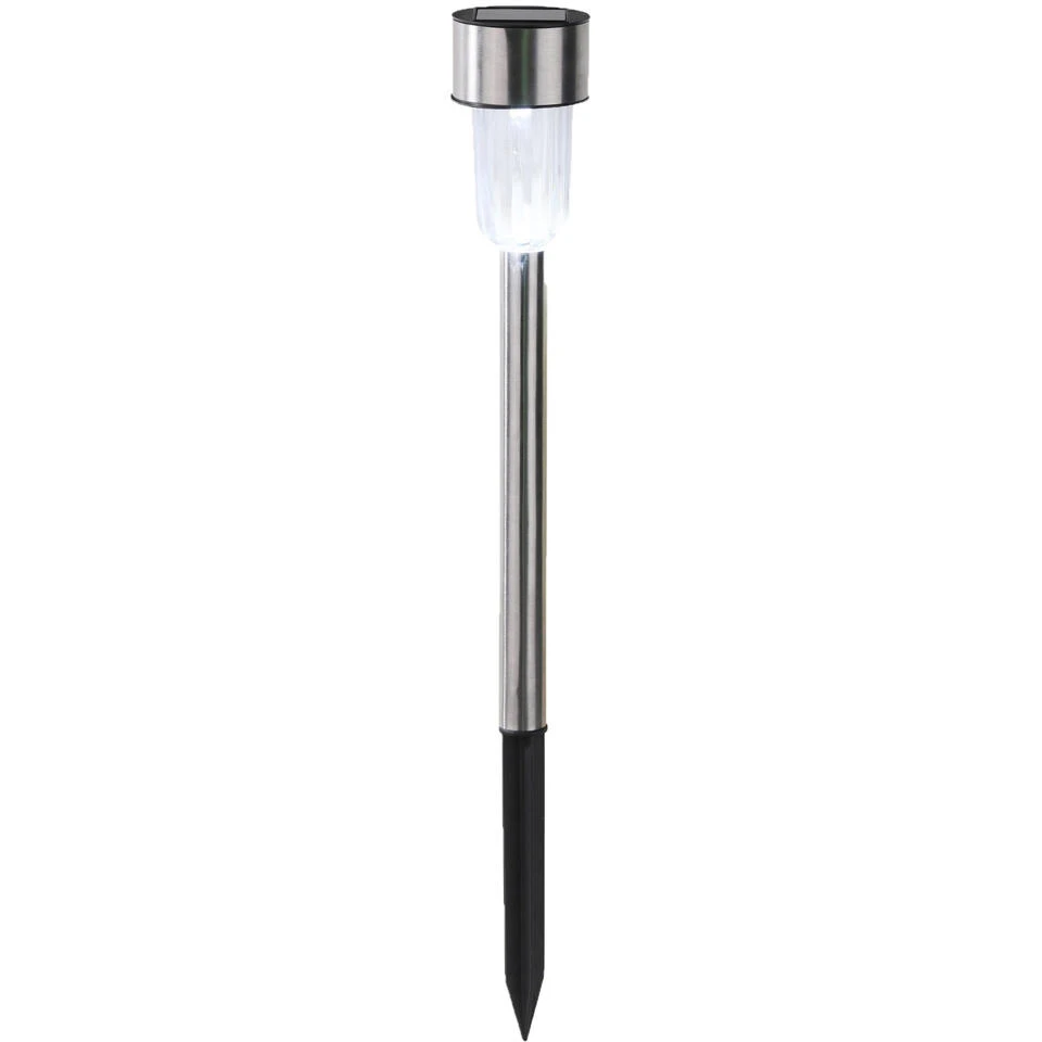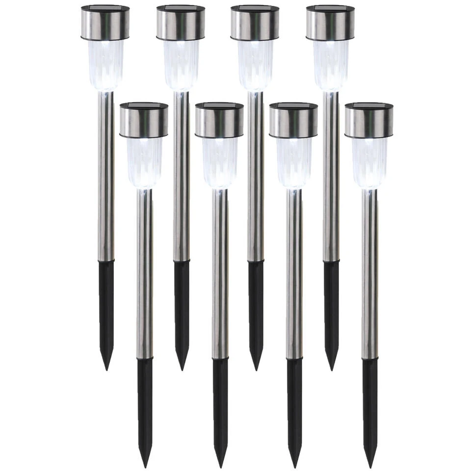 Set van 8x stuks solar tuinlampen, met LED verlichting voor de tuin. De lamp werkt op zonne-energie waardoor het zichzelf oplaadt gedurende de dag. Inclusief grondpin, zodat u ze bijvoorbeeld langs een looppad kunt zetten. Schakelaar: ja. Kleur licht: wit. Kleur lamp: zilver. Afmeting: 5 x 36 cm. Met vervangbare batterijen, inclusief batterijen. Tuinlampen/tuinverlichting/prikspots op zonne-energie.
