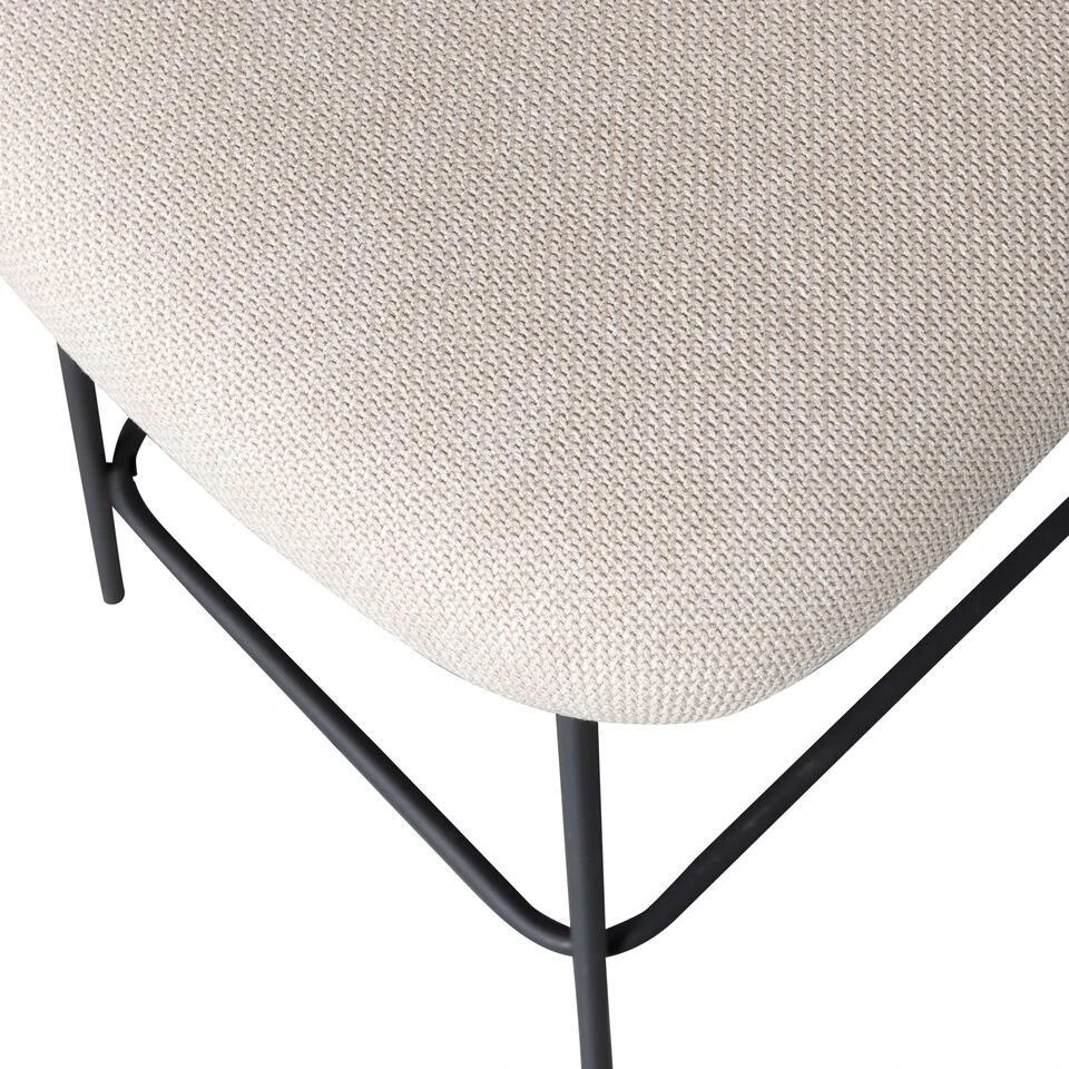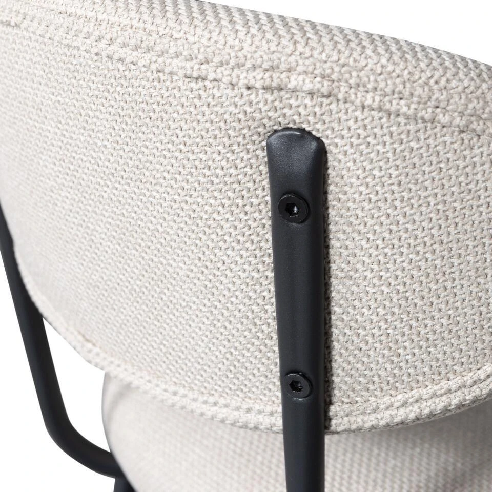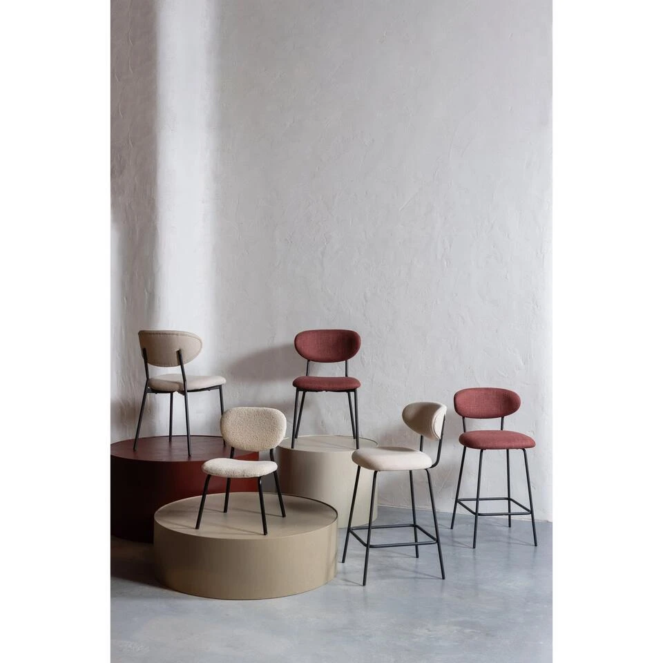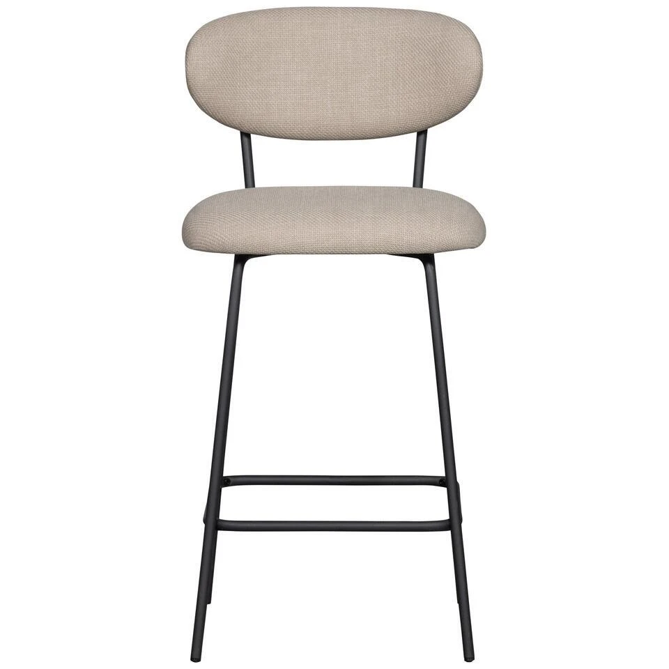 De Kjeld barstoel uit de collectie van het Nederlandse merk WOOOD kenmerkt zich als stijlvol en eenvoudig. Het slanke metalen frame in zwarte kleur vormt een modern contrast met de dikke geweven stof van de zitting. De bolling van de rugleuning en de geweven stof zorgen voor een comfortabele zitervaring. De Kjeld is ook verkrijgbaar als eetkamerstoel.