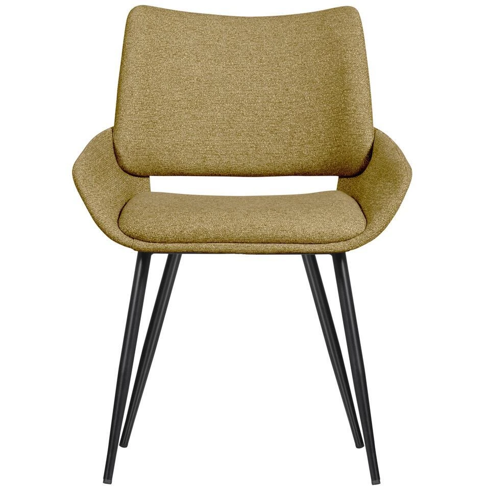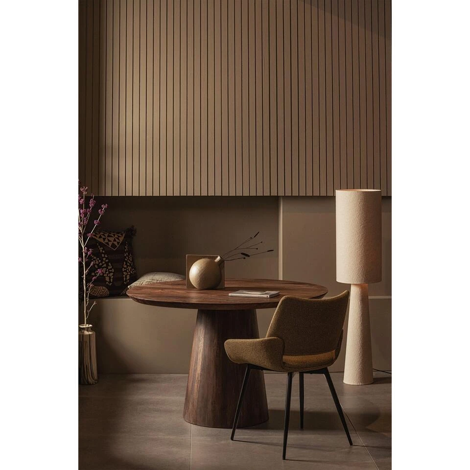 De Parade eetkamerstoel, uit de collectie van het Nederlandse interieurmerk WOOOD, heeft een subtiele kuipvormige zitting bekleed met een warme melangestof. De conische metalen poot geeft de stoel een luchtige uitstraling.