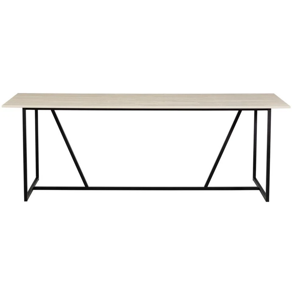 Het tafelblad is gemaakt van essenhout (vingerlas), heeft een geschuurde afwerking gekregen en is afgelakt in de kleur dust. Het onderstel is gemaakt van metaal met een matzwarte poedercoating. Essenhout is een iets zachte houtsoort met een strakke, rechte nerf. De rechte nerftekening zorgt ervoor dat essenhout goed gebogen kan worden, dit maakt essenhout zeer geschikt voor de meubelbranche. Bewerkt essenhout is sterk en slijtvast, maar onbehandeld essenhout kan veel werking vertonen en snel vergelen. Geschuurd essenhout zorgt voor een nette, gladde uitstraling. Geborsteld essen heeft meer karakter en bandgezaagd essenhout heeft een zeer robuuste en ruwe look.