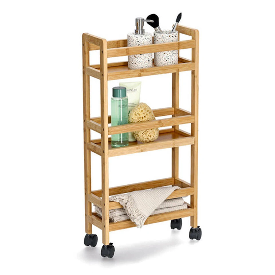 Zeller Keuken Trolley gemaakt van bamboe hout met 3 niveaus en handige zwenkwielen. Optimaliseer je keukenruimte met deze elegante en functionele keuken trolley. Gemaakt van bamboe hout in een warme bruine kleur, biedt deze trolley drie niveaus voor het opbergen en organiseren van je keukenspullen. De trolley is uitgerust met vier zwenkwielen, waardoor hij gemakkelijk te verplaatsen is, zelfs in een drukke keukenomgeving. Met afmetingen van 36 x 15 x 74 cm is deze keuken trolley een compacte maar ruime oplossing voor extra opbergruimte. Met zijn drie niveaus, compacte formaat, en gemakkelijke verplaatsbaarheid dankzij de zwenkwielen, is deze trolley de ideale oplossing voor wie extra opbergruimte nodig heeft zonder in te boeten aan stijl, of het nu in de keuken, op kantoor of in de badkamer is. deze smalle trolley past gegarandeerd in elke nis, hoe klein ook. Afmeting: ca. 36 x 15 x 74 cm. Materiaal: bamboe hout/MDF. Merk: Zeller.