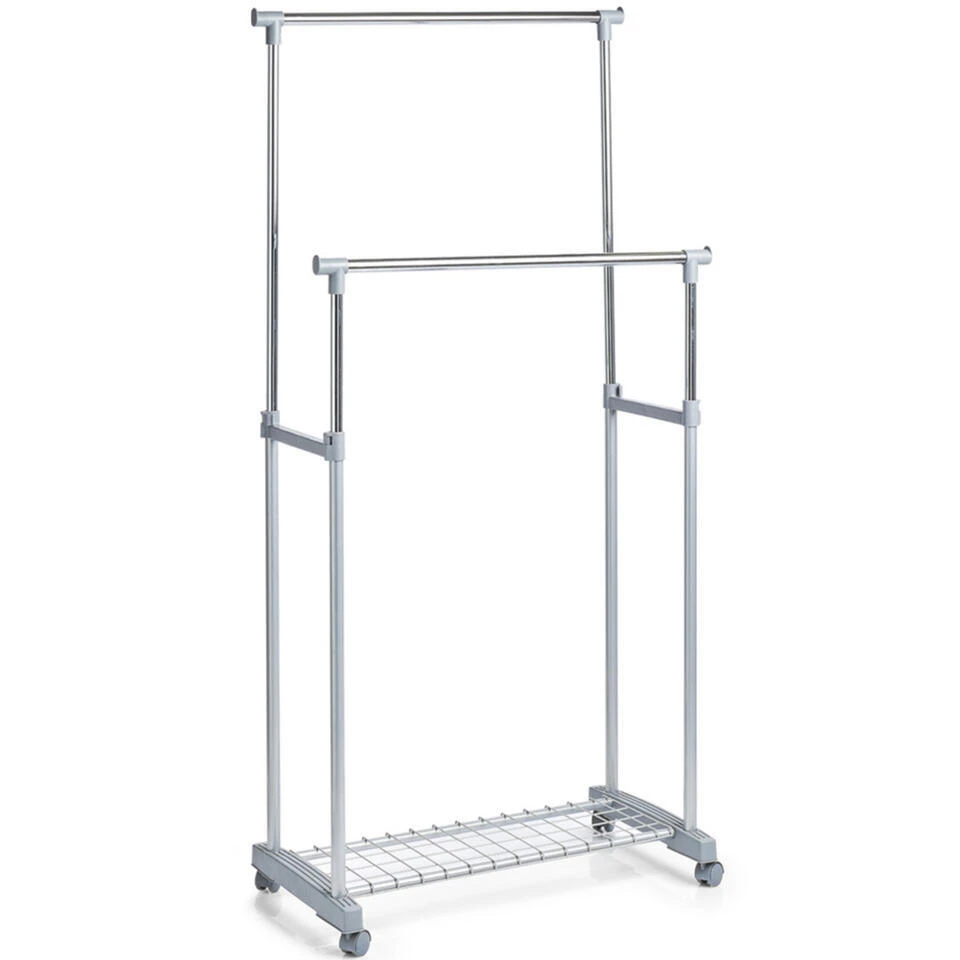 Een mobiel kledingrek met dubbele stang, in hoogte verstelbaar. De kast is makkelijk in elkaar te zetten en heeft 4 zwenkwielen, waarvan 2 stuks met een slot. Aan de onderkant kunt u uw schoenen kwijt. De hoogte is per stang verstelbaar van min. 93 cm tot max. 170 cm.