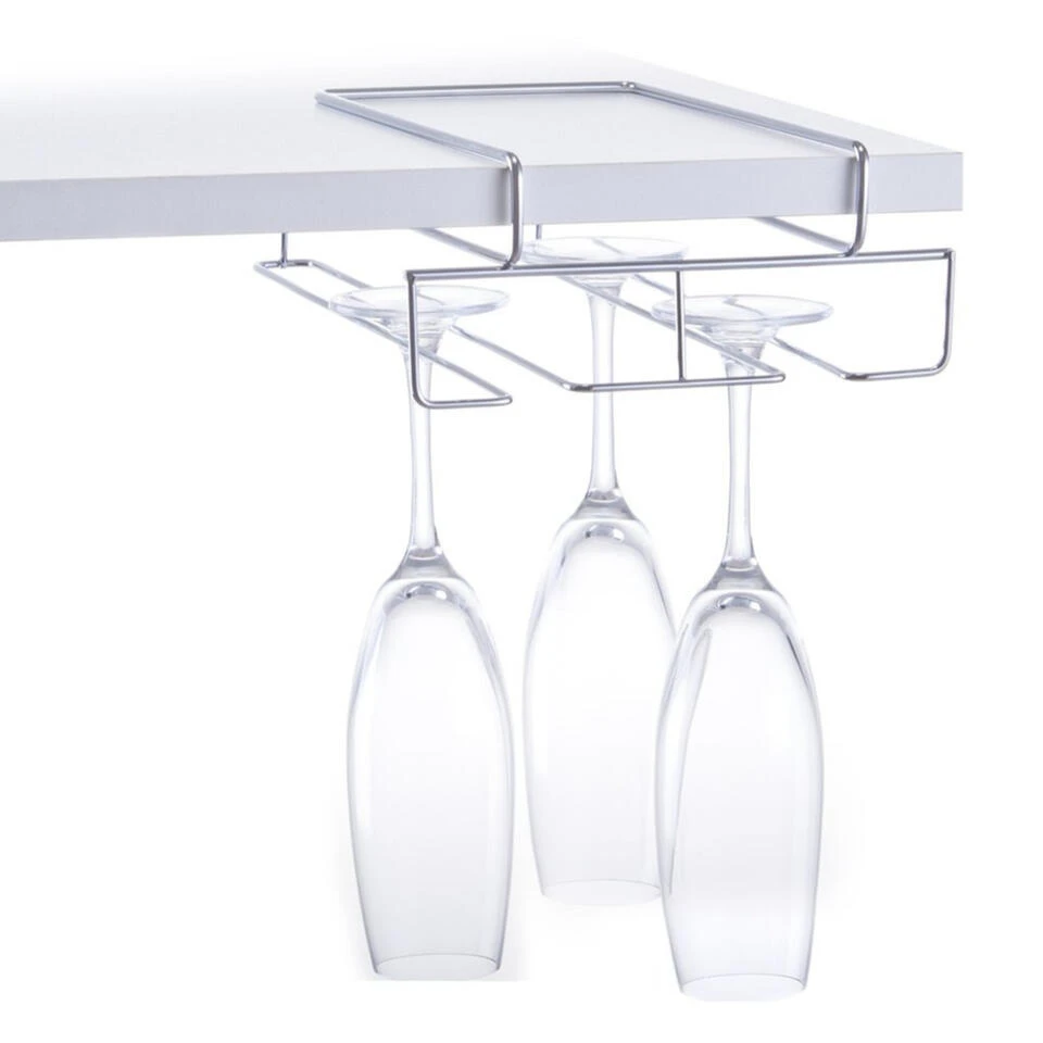 Een zilver rekje om aan de plank in een keukenkastje te hangen, geschikt voor 4 wijn/champagneglazen. Met behulp van deze houder kunt u 4 wijnglazen ophangen in het kastje. Tevens geschikt om onder een kastje te hangen, aan de onderste plank, zodat u meer ruimte heeft in het kastje. De wijnglashouder kan worden gehangen aan een plank met een dikte van max. 3 cm.