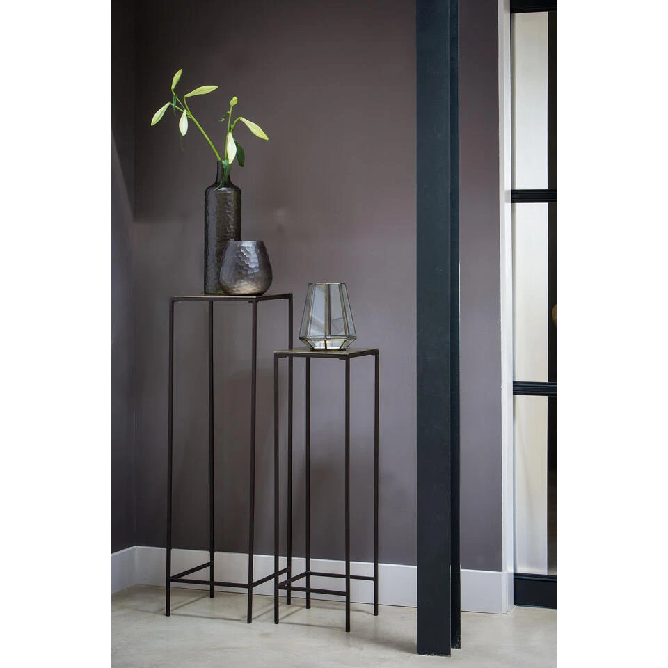 De maten van deze bijzettafel zijn 30 x 30 x 120 cm en hij is uitgevoerd in de kleur bruin. Door het gebruik van metaal​ geeft deze bijzettafel je interieur een statige en klassieke look. De rechte vormen van deze bijzettafel zorgen voor een strakke uitstraling. ​​Een bijzettafel zorgt voor een hoop gemak. Je kunt er makkelijk spullen op kwijt of presenteert er een of meerdere accessoires op. Dit soort kleinmeubelen verwerken in je interieur creëert een boel gezelligheid.​ Meer tafel voor hetzelfde geld? Dit product bestaat uit een set van 2. Deze bijzettafel wordt voorgemonteerd geleverd. Dit product is echt uniek! Met de hand gemaakt en bevat oneffenheden.